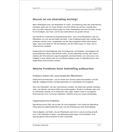 Für das Debriefing sollten Sie interne Unterlagen wie Stellenbeschreibungen, Ablaufdiagramme oder Handlungsanleitungen als Grundlage nutzen. Wenn Sie Aufgaben, Abläufe und Arbeitsplatz des bisherigen Stelleninhabers gemeinsam für das Debriefing analysieren, können Sie Ihre Ergebnisse in der Vorlage und Checkliste Fragen und Aspekte für das Debriefing und das Übergabeprotokoll festhalten.