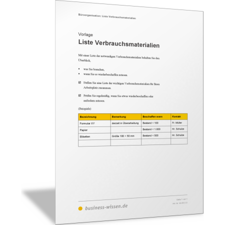 Mit dieser Liste der notwendigen Verbrauchsmaterialien behalten Sie den Überblick, was Sie benötigen und wann Sie es wiederbeschaffen müssen. Sie führen diese Liste wie eine private Einkaufsliste. So vergessen Sie nichts und beschaffen alles zur rechten Zeit.