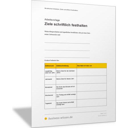 Ziele entfalten erst dann ihre Wirkung, wenn Sie diese aufschreiben und immer vor Augen haben. Nutzen Sie diese Vorlage, um Ihre wichtigsten Ziele festzuhalten. Formulieren Sie dabei auch Ihr eigentliches Lebensziel; das macht Ihre Ziele sinnvoll und motiviert bei der Zielerreichung.