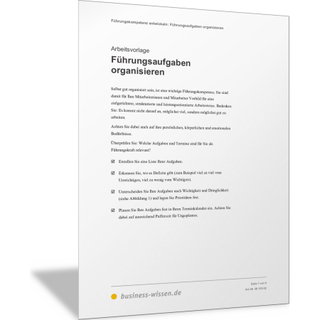Mit dieser Vorlage überprüfen Sie, welche Aufgaben für Sie als Führungskraft relevant sind. Sie erstellen eine Liste, setzen Prioritäten, erkennen, wo es Defizite gibt, planen Ihre Aufgaben fest in Ihren Terminkalender und sorgen so für eine gelungene Selbstorganisation. Planen Sie damit insbesondere Ihre Führungsaufgaben und seien Sie Vorbild für Mitarbeiterinnen und Mitarbeiter. Denn diese wissen zu schätzen, wenn ihre Vorgesetzten gut organisiert sind.
