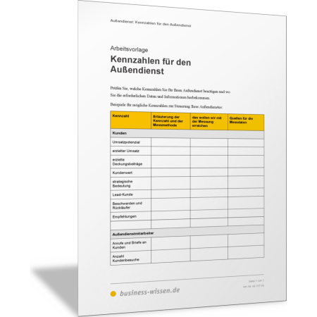 Der Außendienst wird über Kennzahlen gesteuert. Diese beschreiben nicht nur das Leistungsvermögen, der einzelnen Mitarbeiterinnen und Mitarbeiter, sondern auch die Kundenpotenziale und die Leistung des Außendienstes insgesamt. In dieser Vorlage sind wichtige Kennzahlen für den Außendienst aufgelistet. Sie prüfen anhand der Unternehmens- und der Außendienstziele, welche Kennzahlen in Ihrem Fall wichtig sind und welche Sie messen und auswerten wollen. Damit steuern Sie die Leistungen Ihrer Außendienstorganisation.