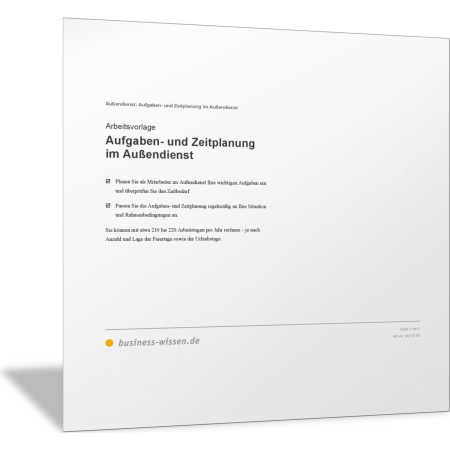 In dieser Vorlage finden Sie die wichtigsten Aufgaben und Tätigkeiten im Außendienst. Erstellen Sie auf dieser Grundlage als Mitarbeiterin oder Mitarbeiter im Außendienst Ihren persönlichen Arbeitsplan, Ihre To-do-Liste, und halten Sie fest, welche der vielen Aufgaben Sie wann erledigen wollen.