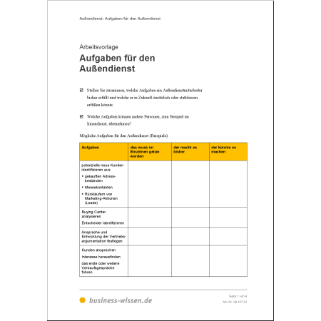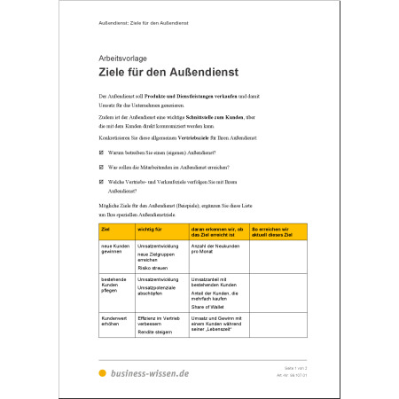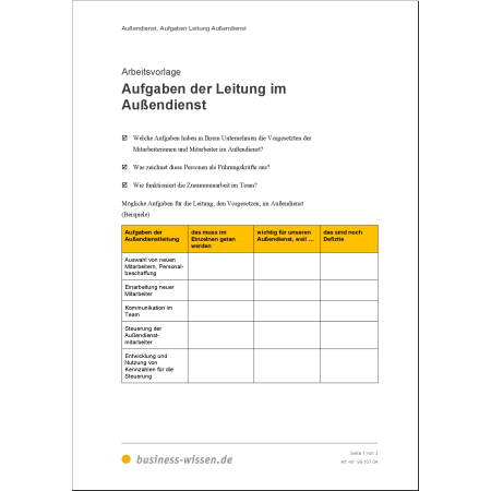Als Führungskraft im Vertrieb legen Sie die Ziele Ihres Außendienstes fest und leiten daraus konkrete Aufgaben für Ihre Mitarbeitenden ab. Mit der Vorlage „Aufgaben für den Außendienst“ klären Sie: