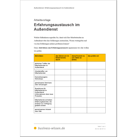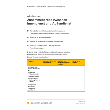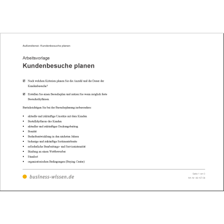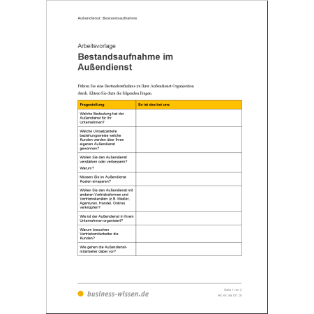 Bevor Sie Maßnahmen zur Verbesserung einleiten, sollten Sie die aktuelle Situation im Außendienst analysieren. Mit der Vorlage „Bestandsaufnahme im Außendienst“ prüfen Sie unter anderem:
