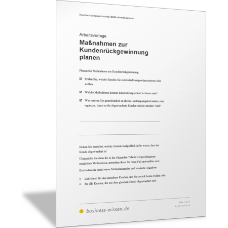 Planen Sie mit dieser Vorlage Maßnahmen zur Kundenrückgewinnung und prüfen Sie, welche Kunden Sie individuell ansprechen müssen oder wollen. Überlegen Sie anhand der in der Vorlage genannten Ursachen für Kundenabwanderung: Was müssen Sie grundsätzlich an Ihrem Leistungsangebot ändern oder ergänzen, damit es für abgewanderte Kunden wieder attraktiv wird? In der Vorlage finden Sie zahlreiche Beispiele für Maßnahmen zur Kundenbindung.