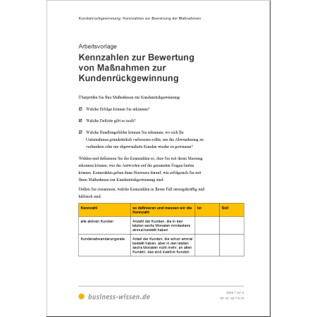 Im letzten Schritt planen Sie Maßnahmen zur Kundenrückgewinnung und überprüfen deren Wirkung. Damit sich der Aufwand lohnt, sollten Sie Kennzahlen nutzen, die zeigen, wie erfolgreich Sie sind, Ihre Kunden zurückzugewinnen. Diese Kennzahlen definieren Sie maßgeschneidert mit der Vorlage Kennzahlen zur Bewertung der Kundenrückgewinnung.