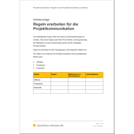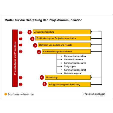 Klären Sie dann die Rahmenbedingungen für eine erfolgreiche Projektkommunikation. Was dafür notwendig ist, zeigt die Übersicht: Projektkommunikation Schritt für Schritt. Hier halten Sie fest, was wichtig ist für die Bewusstseinsbildung, für das Leitbild und welche Regeln gelten sollten.