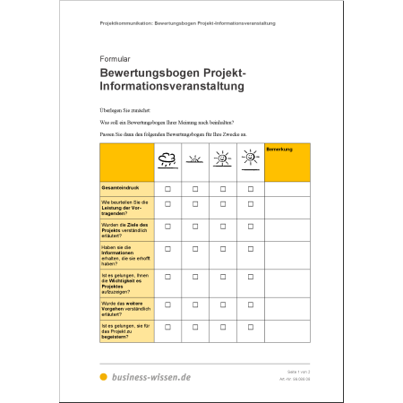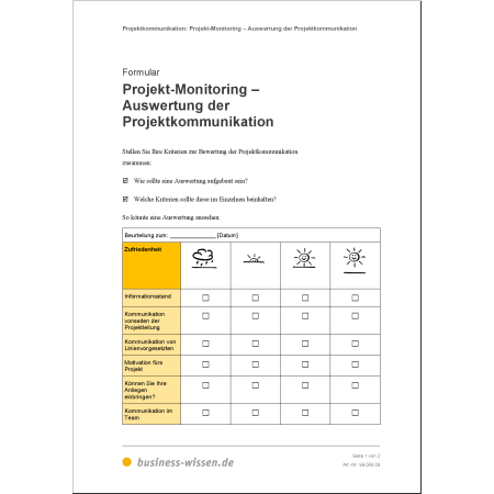 Ob diese Maßnahmen wirksam sind, sollten Sie regelmäßig prüfen. Nutzen Sie dazu unter anderem das Beispiel (Muster) für einen speziellen Bewertungsbogen für die Projektkommunikation.