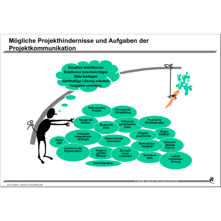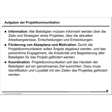 Die Projektkommunikation wird in die Projektorganisation integriert und mit den Projektzielen verknüpft. Zeigen Sie auf, welche Bedeutung die Projektorganisation für Ihr Projekt hat, indem Sie dies in der Vorlage Projekt-Charta zusammenfassen. Mit der Präsentation: Ziele, Erfolgsfaktoren und Aufgaben der Projektkommunikation schaffen Sie dafür das Verständnis.