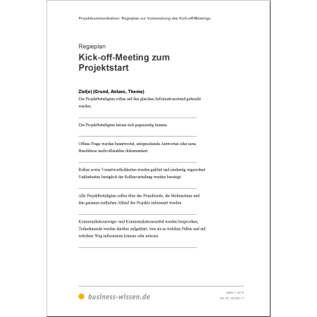 Ein besonders wichtiger Baustein der Projektkommunikation ist das Kick-off-Meeting. Nutzen Sie die Vorlagen und den Ablaufplan in diesem Dokumentenpaket, um diese Veranstaltung zu planen und vorzubereiten.