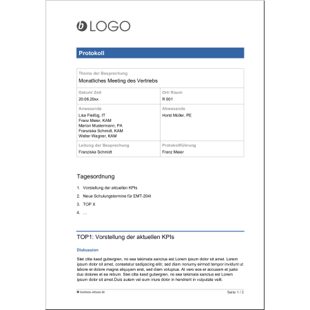 Für das ausführliche Protokoll finden Sie in diesem Dokumentenpaket eine Vorlage als Formular, mit der Sie alle wichtigen Inhalte schon während der Besprechung zusammenstellen und aufschreiben können. Neben den Rahmenbedingungen wie Thema, Ort, Zeit und Teilnehmende halten Sie die Inhalte fest: