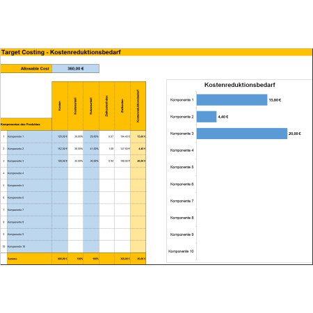 Das Beispiel-Produkt, anhand dessen die Zielkostenrechnung Schritt für Schritt vorgestellt wird, ist ein Fahrrad. Ausgehend von den Kundenanforderungen werden mit der Vorlage Beispiel für die Zielkostenrechnung (Target Costing) die Allowable Costs, die Drifting Costs und die Target Costs berechnet. Durch eine Nutzen-Funktionen-Matrix werden die Target Costs auf einzelne Produktkomponenten verteilt.