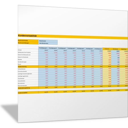 Mit der Excel-Vorlage ermitteln Sie für einen einzelnen Key-Account-Kunden die Kundenrentabilität. Sie ermitteln für einzelne Produkte den Umsatz und sämtliche Kosten, die der Kunde verursacht. Daraus ergeben sich Kundendeckungsbeitrag und Kundenrentabilität, die in dieser Vorlage nach Produktgruppen differenziert sind. Sie können bis zu sieben Produktgruppen analysieren. Außerdem können Sie die erzielten Ist-Werte mit Ihren geplanten Werten vergleichen und Abweichungen erkennen.