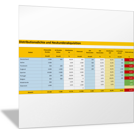 Mit dieser Excel-Vorlage analysieren Sie, welchen Anteil von allen potenziellen Kunden Sie bereits zu Ihrem Kundenkreis zählen. Sie halten dazu unterschiedliche Märkte, Kundensegmente oder Regionen und die Zahl der Kunden fest. Dem stellen Sie gegenüber, wie viele Kunden Sie dort bereits haben und wie viele Neukunden Sie in diesen Märkten jeweils gewinnen wollen. Daraus wird die Distributionsdichte berechnet.