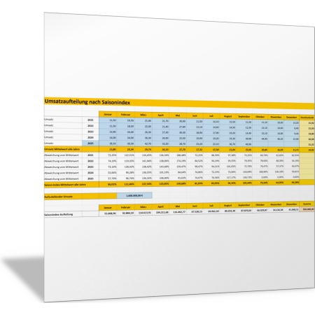 Mit dieser Excel-Vorlage analysieren Sie die Verteilung des Umsatzes über ein gesamtes Jahr. Sie erkennen, inwiefern saisonale Effekte (Saisonindex) eine Rolle spielen, und bestimmen, welche Monate stark und welche schwach sind. Sie erfassen für die letzten fünf Jahre die Umsätze pro Monat. Die Vorlage berechnet mit Mittelwerten, welche Monate überdurchschnittlich hohe und welche weniger hohe Umsätze haben. Daraus wird ein Saisonindex berechnet. Durch diesen Vergleich können sie die saisonalen Effekte erkennen und für die zukünftige Umsatzplanung nutzen.