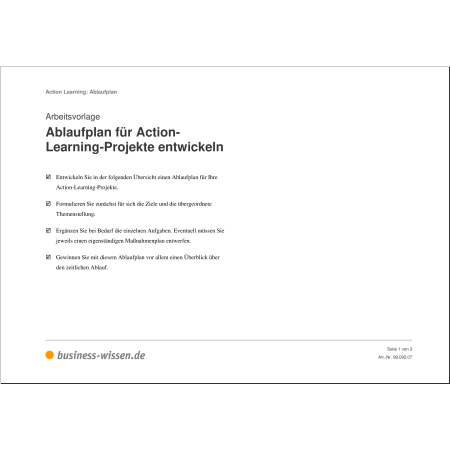 Die Dauer eines Action-Learning-Programms hängt von den Aufgaben und Problemstellungen ab, die die Teilnehmenden lösen sollen. Wichtig ist daher ein Ablaufplan mit den Zielen und der zeitlichen Planung. Nutzen Sie dafür die Vorlage Ablaufplan für Action Learning-Projekte. Damit planen Sie nicht nur die Projektbearbeitung, sondern auch die Lernziele und Lerninhalte für die Teilnehmenden.