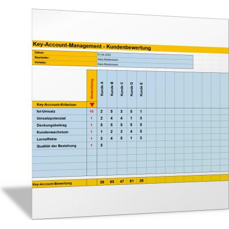 In dieser Excel-Tabelle erhält jeder Kunde einen gewichteten Kundenwert. Der Kundenwert ergibt sich aus der Bewertung unterschiedlicher Kriterien, die für Ihr Key-Account-Management wichtig sind. Die Bewertung zeigt, wo Handlungsschwerpunkte für das Key-Account-Management sein könnten und wohin Sie die Kunden entwickeln sollten.
