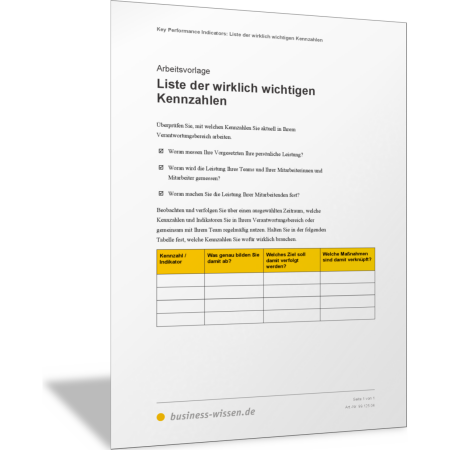 Stellen Sie in dieser Vorlage zusammen, welche Kennzahlen und Indikatoren Sie in Ihrem Verantwortungsbereich für die Planung und Steuerung der Prozesse und Mitarbeitenden nutzen. Welche sind wirklich wichtig für Ihre Aufgaben als Führungskraft und für die Zusammenarbeit, die Planung und Steuerung in Ihrem Team? Halten Sie diese Kennzahlen in dieser Liste fest und erläutern Sie den genauen Zweck der Kennzahl. Diese wirklich wichtigen Kennzahlen können dann Ihre Key Performance Indicators (KPI) sein.