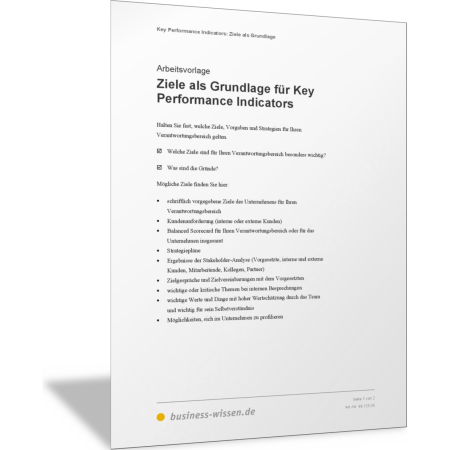 Bestimmen Sie die Ziele, die Sie in Ihrem Verantwortungsbereich erreichen müssen. Sie ermitteln mit dieser Vorlage, woraus sich Ihre persönlichen Ziele und die Ziele Ihres Teams ableiten und ergeben. Dann halten Sie in einer Tabelle fest, welche Ziele für Sie und Ihr Team wirklich wichtig sind. Für diese wichtigen Ziele legen Sie in einem nächsten Schritt die Kennzahlen und Key Performance Indicators fest, mit denen Sie die Zielerreichung messen und erkennen.
