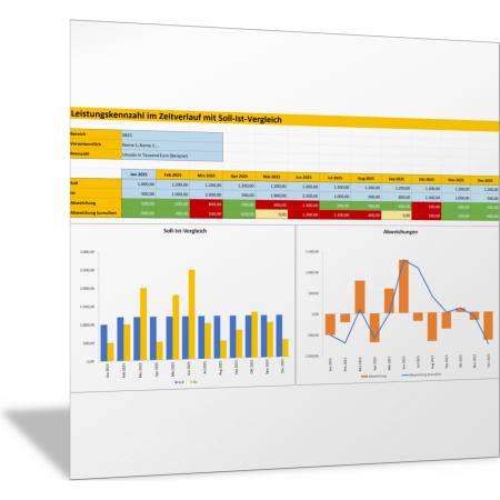 In dieser Excel-Vorlage stellen Sie für eine beliebige Kennzahl die Soll-Vorgaben sowie Ist-Werte für 12 Monate zusammen. In der Vorlage werden die monatlichen sowie die kumulierten Abweichungen berechnet. Die Ergebnisse werden in Form von zwei Diagrammen (Säulen- und Liniendiagramm) dargestellt.