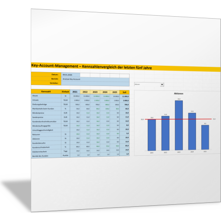 Mit dieser Excel-Vorlage werden die wichtigen Kennzahlen zusammengestellt. Soll-Ist-Abweichungen werden sichtbar. Die Kennzahlen für unterschiedliche Key-Account-Teams können nebeneinandergelegt werden. In einem Diagramm wird der Zeitverlauf der Kennzahlen dargestellt.
