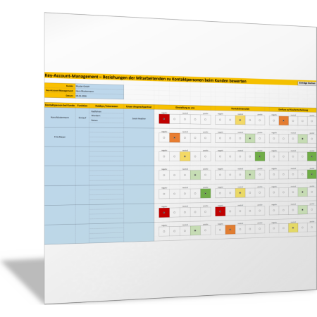 In dieser Excel-Vorlage können Sie für alle Personen im Buying-Center des Key-Account-Kunden festhalten, welche Funktion, welche Hobbys, welche Einstellung, welchen Einfluss auf die Kaufentscheidung die jeweilige Person hat und welche Kontaktintensität besteht. Sie beschreiben und bewerten den jeweiligen Einfluss der Person im Hinblick auf die Zusammenarbeit mit Ihrem Unternehmen. In dieser Vorlage können Sie bis zu sieben Personen und jeweils bis zu vier Merkmale beschreiben und bewerten.