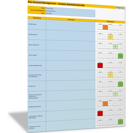 In dieser Excel-Vorlage können Sie Kriterien zur Beschreibung der Marktattraktivität festhalten und bewerten. Sie zeigen auf, wie attraktiv ein Key-Account für Ihr Unternehmen ist und welche Marktentwicklungen und Einflussfaktoren dabei wichtig sind. Die Kriterien für die Marktattraktivität des Kunden in dieser Checkliste sind: Marktvolumen, Marktwachstum, Marktanteile, Risiken, Preisniveau, Gewinnmargen, Substitutionsgefährdung, Modetrends, öffentliche Investitionen, Subventionen und Förderprogramme sowie Wettbewerbsintensität.