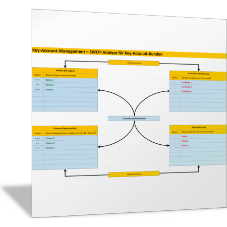 Mit dieser Excel-Vorlage erfassen Sie die Stärken, Schwächen, Chancen und Risiken Ihres Key-Account-Kunden und stellen diese in der SWOT-Übersicht zusammen. Sie bewerten dabei die einzelnen Stärken, Schwächen, Chancen und Risiken auf einer Skala: von besonders positiv (+++) bis besonders negativ (- - -). So erkennen Sie, welche Potenziale mit diesem Key-Account-Kunden verbunden sind und wo Sie ihn mit Ihren Stärken unterstützen können.