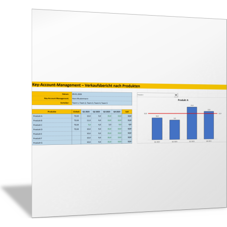 Mit dieser Excel-Vorlage können Sie eine Übersicht über Ihren Verkaufserfolg mit einem ausgewählten Key-Account-Kunden erstellen – bezogen auf einzelne Produkte oder Produktkategorien. Sie stellen die entsprechenden Umsätze (oder andere relevante Kennzahlen) im Zeitverlauf (Quartal oder andere Raster) dar. So haben Sie eine Umsatzübersicht zu Ihrem Key-Account-Kunden. Das Ergebnis können Sie mit einer Soll- oder Planvorgabe vergleichen.