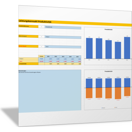 Mit dieser Excel-Vorlage berechnen Sie die Produktivität auf der Grundlage einer Input-Größe und einer Output-Größe. Sie definieren den Input und den Output und die Produktivität, die Sie als Verhältnis von Output zu Input berechnen. In einem Diagramm wird die von Ihnen definierte Produktivitätskennzahl im Zeitverlauf über fünf Jahre dargestellt.