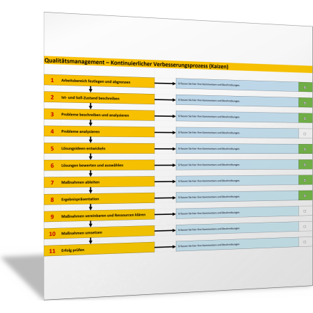Für die ständige Verbesserung der Qualität im Unternehmen steht die „Philosophie“ der kontinuierlichen Verbesserung beziehungsweise des Kaizen. Die Vorgehensweise und die dabei wichtigen Schritte finden Sie in dieser Excel-Vorlage. Planen Sie, welche Maßnahmen Sie bei jedem Schritt durchführen wollen und wie weit Sie mit der Umsetzung jeweils sind.