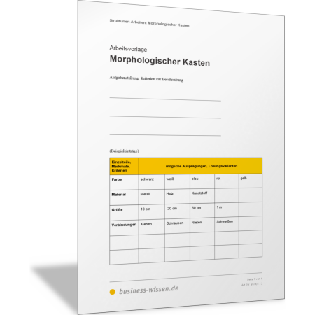 Nutzen Sie diese Vorlage für die Erstellung eines Morphologischen Kastens. Sie formulieren Ihr Problem oder Ihre Aufgabe und zerlegen sie in mehrere Merkmale oder Elemente. Diese Merkmale oder Elemente lösen Sie einzeln, indem Sie überlegen, welche Lösungsmöglichkeiten oder Ausprägungen es jeweils geben kann. Dann setzen Sie mögliche Teillösungen zusammen und entwickeln eine Gesamtlösung. In der Tabelle halten Sie Ihre Überlegungen dazu in Form des Morphologischen Kastens fest.