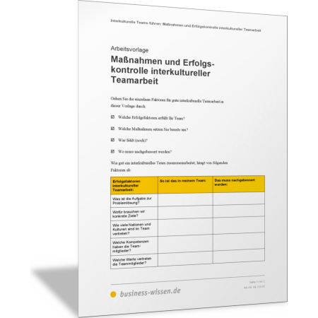 In dieser Vorlage finden Sie die Aspekte, die bei der interkulturellen Teamarbeit wichtig sind, damit das Team funktioniert und die Teamaufgaben erfüllt werden. Prüfen Sie als Führungskraft, ob diese Bedingungen vorliegen, Maßnahmen zur Verbesserung durchgeführt und Erfolge und Wirksamkeit geprüft werden. Verbessern Sie das, was aus Ihrer Sicht noch nicht funktioniert, und planen Sie entsprechende Maßnahmen, um die interkulturelle Teamarbeit zu verbessern.