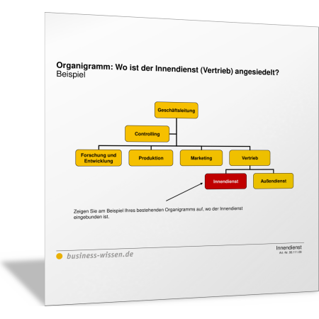 Das Organigramm zeigt ein einfaches Beispiel, wo der Innendienst als Teil des Vertriebs und Verkaufs organisatorisch eingeordnet werden kann. Erstellen oder prüfen Sie Ihr Organigramm und machen Sie die Einordnung des Innendienstes deutlich.