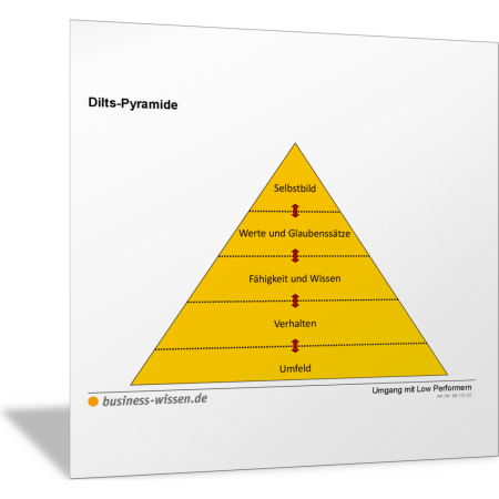 Um die Motive und Bedürfnisse der Mitarbeiterinnen und Mitarbeiter genauer zu hinterfragen, eignet sich die Analyse der neurologischen Ebenen, wie sie Robert Dilts beschrieben hat. Im ursprünglichen Ansatz von Dilts handelt es sich um fünf Ebenen, die in dieser Abbildung dargestellt sind.