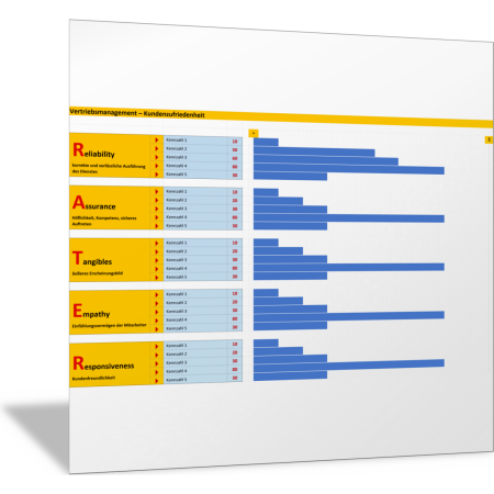 Sammeln Sie die Rückmeldung Ihrer Kunden zu Ihren Unternehmensleistungen, damit Sie sich im Wettbewerb verbessern und die Kunden zufriedenstellen können. Mit dieser Vorlage listen Sie die Kennzahlen zur Kundenzufriedenheit auf und erkennen in einem Diagramm das Profil der Kundenzufriedenheit. Maßgeblich sind die sogenannten RATER-Aspekte zur Kundenzufriedenheit.