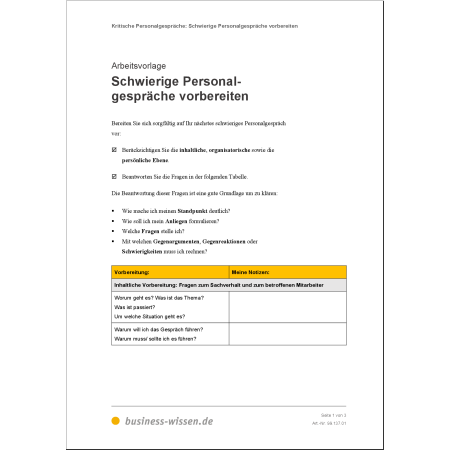 Mit der Vorlage „Schwierige Mitarbeitergespräche vorbereiten“ bereiten Sie sich gezielt vor – inhaltlich, organisatorisch und persönlich. Sie klären unter anderem:
