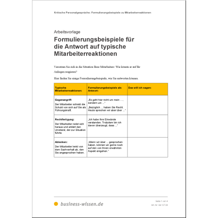 Die Vorlage „Formulierungsbeispiele für typische Mitarbeiterreaktionen“ hilft Ihnen, sachlich und lösungsorientiert zu antworten – auch in angespannten Situationen.
