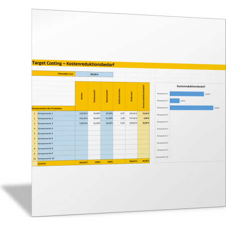Die zulässigen Kosten (Allowable Costs) für jede Produktkomponente ergeben sich aus dem am Markt erzielbaren Produktpreis und den daraus abgeleiteten Gesamtkosten sowie dem Nutzwert, den die Kunden der Komponente zuschreiben. Mit dieser Excel-Vorlage erkennen Sie, wo die tatsächlichen Kosten zu hoch sind und in welchem Maße die Kosten reduziert werden müssen, damit die Allowable Costs gemäß Zielkostenrechnung erreicht werden.