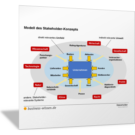 Verschaffen Sie sich mit dieser Übersicht einen Eindruck über das komplexe Kräfteverhältnis zwischen einem Unternehmen und seinen Stakeholdern. Die Übersicht zeigt wie ein Radar, welche Bereiche für ein Unternehmen im Rahmen des Stakeholder-Konzepts und des Stakeholder-Managements relevant sein können.