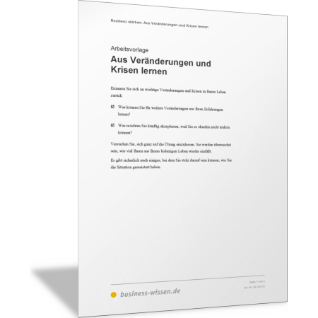 Erinnern Sie sich an wichtige Veränderungen und Krisen in Ihrem Leben? Nutzen Sie diese Vorlage als Selbst-Check und denken Sie damit über wichtige Ereignisse in Ihrem bisherigen Leben nach: Was können Sie für weitere Veränderungen aus Ihren Erfahrungen lernen? Was möchten Sie künftig akzeptieren, weil Sie es ohnehin nicht ändern können?