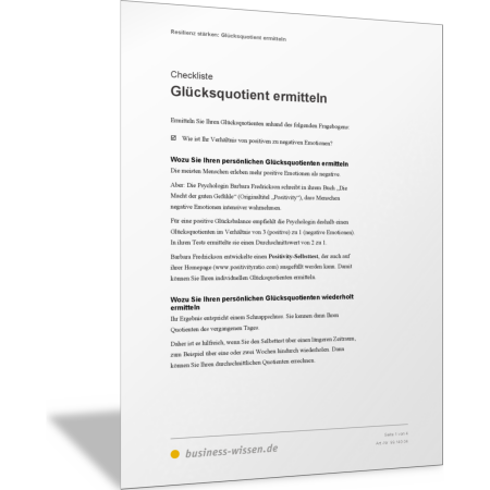 Ermitteln Sie Ihren Glücksquotienten anhand des Positivity-Selbsttests der Psychologin Barbara Fredrickson. Dazu finden Sie in dieser Vorlage Fragen, mit denen Sie Ihre Erlebnisse an einzelnen Tagen reflektieren. Sie machen sich damit die positiven und die negativen Erlebnisse noch einmal bewusst. Aus dem Vergleich der positiven und negativen Bewertungen ergibt sich der sogenannte Glücksquotient.