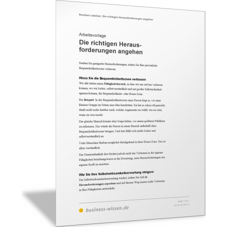 Entwickeln Sie einen Plan und suchen Sie nach Wegen, um die persönliche Komfort- oder Home-Zone zu verlassen und neue Felder zur Selbstwirksamkeit zu finden. Nutzen Sie dafür die Anleitung aus dieser Vorlage. Suchen Sie geeignete Herausforderungen, indem Sie mithilfe der genannten Vorgehensweise mögliche Wege Schritt für Schritt erkunden und festigen.