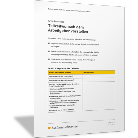 Nutzen Sie diese Vorlage und entwickeln Sie damit ein Konzept und Lösungen, wie Teilzeitarbeit funktionieren kann. Fassen Sie Ihre Überlegungen und Pläne zusammen und stellen Sie Ihr Teilzeitkonzept Ihrem Arbeitgeber vor.