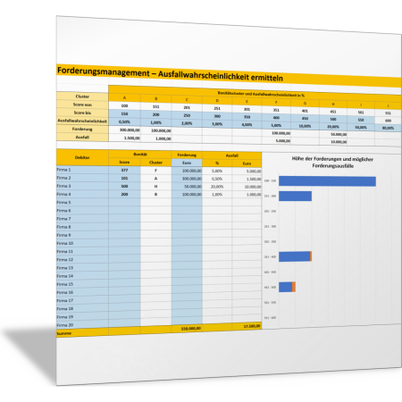 Mit dieser Excel-Vorlage legen Sie zunächst fest, welche Bonitätscluster für Ihre Forderungen relevant sind und wie hoch dabei die Ausfallwahrscheinlichkeit ist. Dann weisen Sie Ihren Kunden (Debitoren) einen Bonitätswert (Score) zu. Mit der Vorlage berechnen Sie dann die Höhe der Forderungen und die Höhe der möglichen Forderungsausfälle für die einzelnen Bonitätsstufen (Cluster). Das Ergebnis sehen Sie in einem Balkendiagramm.