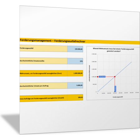 Mit diesem Forderungsausfallrechner (Excel-Vorlage) berechnen Sie, wie viel Mehrumsatz Sie generieren müssen, wenn ein bestimmter Forderungsbetrag ausfällt. Hier besteht über die Umsatzrendite eine erhebliche Hebelwirkung. In einem Diagramm wird abgebildet, wie Forderungsausfall und erforderlicher Mehrumsatz miteinander zusammenhängen. Sie berechnen mit der Vorlage den notwendigen Mehrumsatz (in Euro) und die Zahl der dafür notwendigen Aufträge (bei angenommenem Umsatz pro Auftrag).