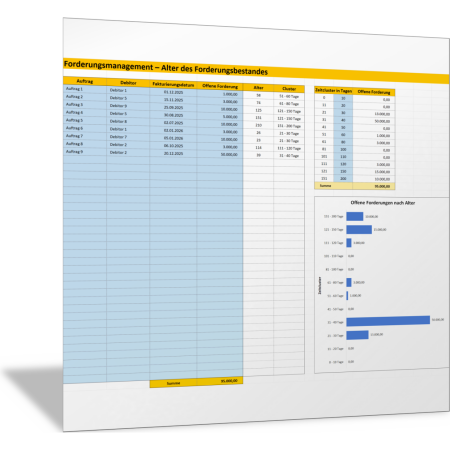 Mit dieser Excel-Vorlage stellen Sie für alle Aufträge und Rechnungen zusammen, wann die Rechnungsstellung erfolgte und wie lange Sie bereits auf die Zahlung warten. Daraus ergibt sich das Alter der Forderung (in Tagen). Sie bilden anschließend Klassen und zeigen das Forderungsalter in einem Balkendiagramm für die Analyse der Summe an Forderungen je Altersklasse (Zeitcluster). So erkennen Sie die Struktur Ihres Forderungsbestands und können den Mahnprozess optimieren.