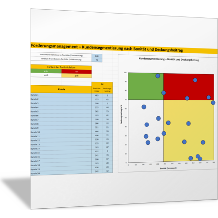 Mit dieser Excel-Vorlage weisen Sie allen Kunden einen Bonitätsindex zu und vergleichen diesen mit dem durchschnittlichen Deckungsbeitrag, den Sie mit diesem Kunden erzielen. Daraus entsteht ein Portfolio-Diagramm, in dem Sie für bis zu 20 Kunden erkennen, wie das Verhältnis von Bonität und Deckungsbeitrag ist. Sie erkennen, wie viele Kunden in die vier vorgegebenen Risikoklassen nach Bonität (niedrig und hoch) und Deckungsbeitrag (in Prozent) fallen. Mit dieser Portfolio-Darstellung können Sie die Kunden in den vier Segmenten unterschiedlich behandeln in Bezug auf Ihre Mahn-Strategie.