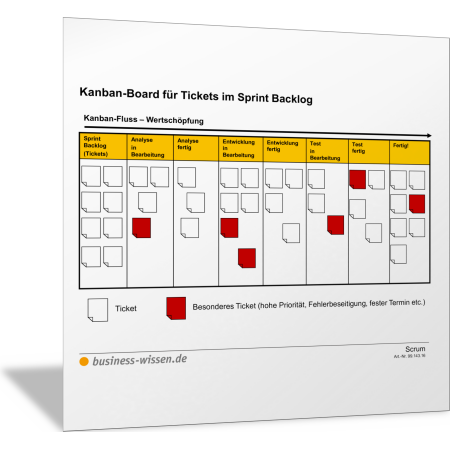 In dieser Abbildung ist der Aufbau eines Kanban-Boards dargestellt, wie es bei Scrum-Projekten genutzt wird. Damit hat das Scrum-Team jederzeit den Überblick über alle Arbeiten im Sprint und über den Stand des Sprint Backlogs und der Tickets.
