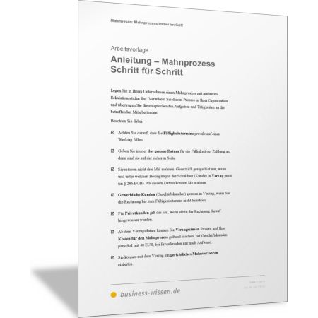 In dieser Vorlage finden Sie eine Übersicht über die einzelnen Stufen im Mahnprozess, von der Rechnungsstellung, über Zahlungserinnerung und Mahnungen bis zum gerichtlichen Mahnverfahren. Sie können Ihre Maßnahmen, die Sie in jeder Stufe ergreifen wollen, mithilfe dieser Anleitung planen. Wichtig ist, dass Sie den Schuldner (Ihr Kunde) richtig über seine Zahlungspflicht und den Zahlungsverzug informieren und dass Sie dann Schritt für Schritt und konsequent Ihren definierten Mahnprozess durchlaufen. Alle wichtigen Informationen dazu finden Sie in dieser Anleitung für Zahlungserinnerungen und Mahnungen.